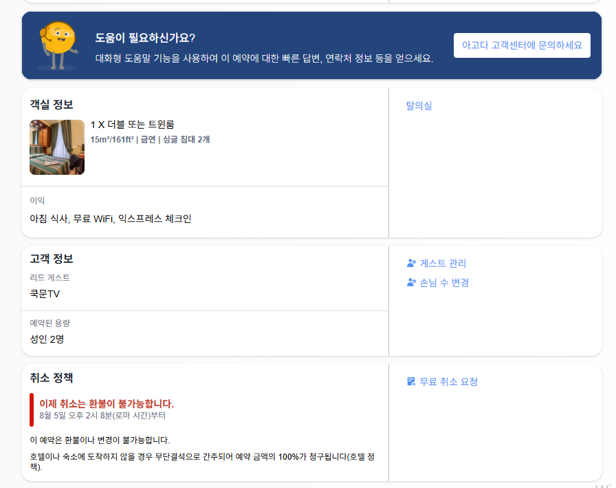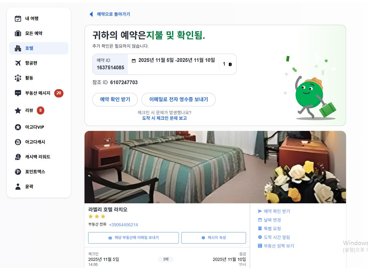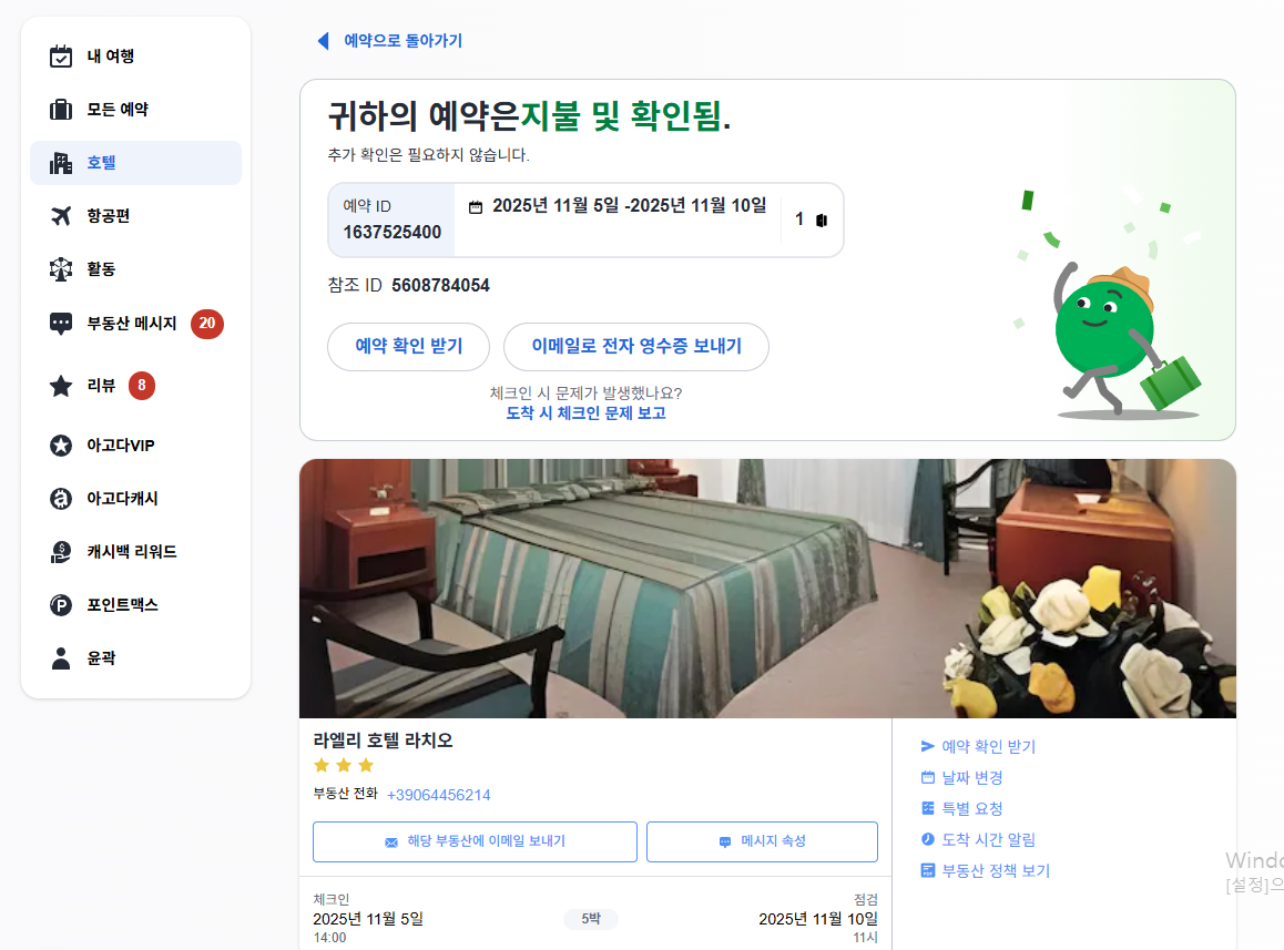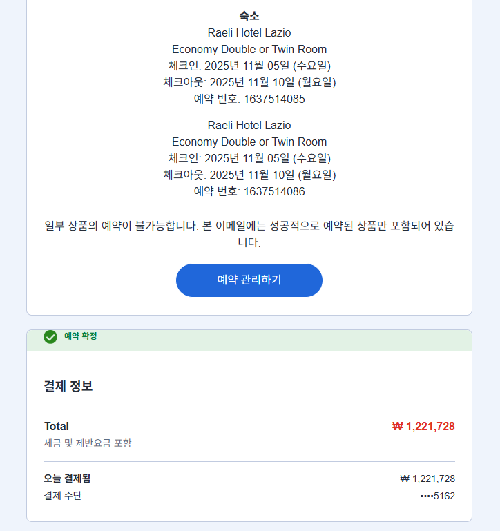 로마 라엘리 호텔 라치오 이코노미 더블룸 * 2 = 1,221,728원