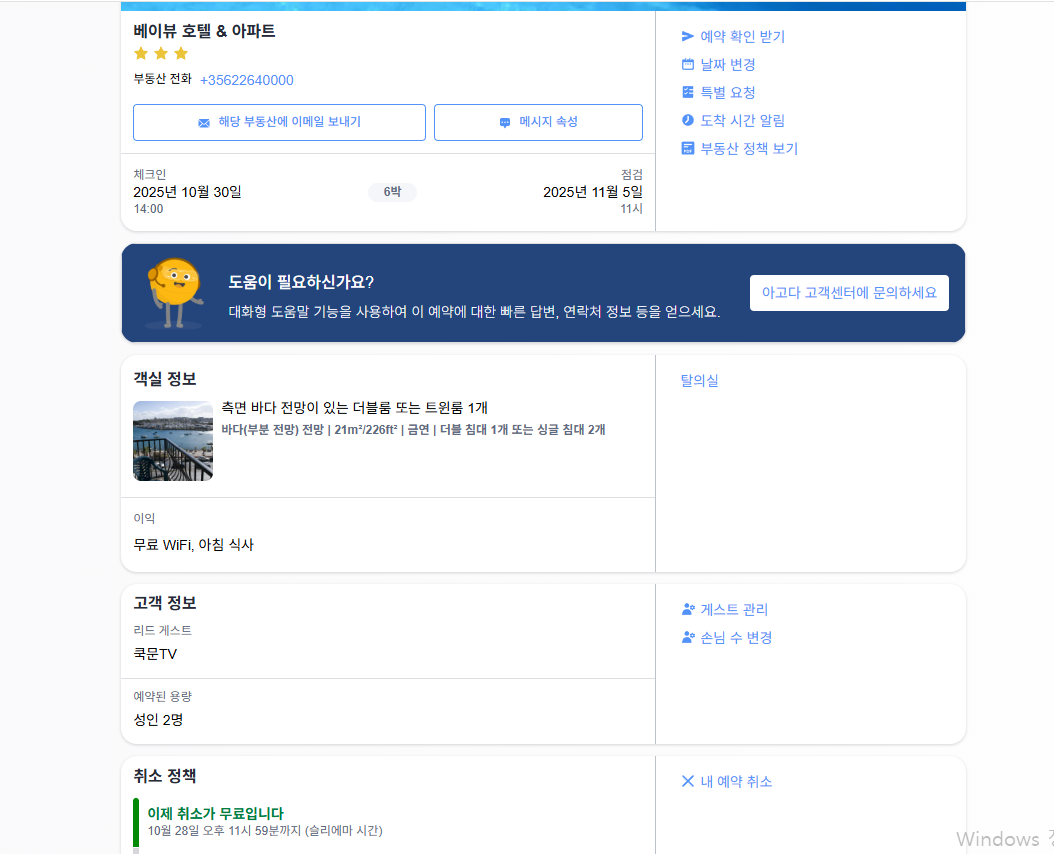 10월 30일 부터 11월 5일까지 측면 바다 뷰가 보이는 방 *1 = 445유로